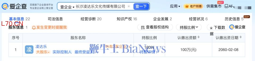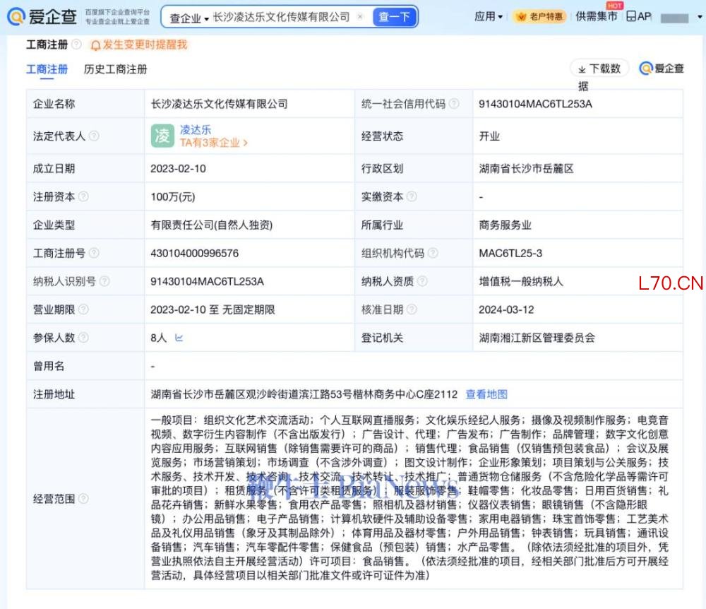 爱企查App显示,长沙凌达乐文化传媒有限公司成立于2023年2月,法定代表人为凌达乐,注册资本100万元人民币,经营范围包括个人互联网直播服务、文化娱乐经纪人服务、摄像及视频制作服务等,由凌达乐全资持股。