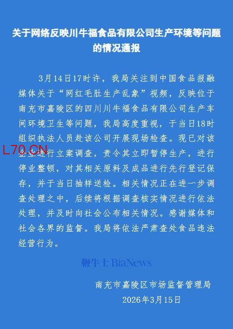 3月14日17时许,我局关注到中国食品报融媒体关于“网红毛肚生产乱象”视频,反映位于南充市嘉陵区的四川川牛福食品有限公司生产车间环境卫生等问题,我局高度重视,于当日18时组织执法人员赴该公司开展现场检查。现已对该企业进行立案调查,责令其立即暂停生产,进行停业整顿,对其相关原料及成品进行先行登记保存,并于当日抽样送检。相关情况正在进一步调查处理之中,后续将根据调查核实情况进行依法处理,并及时向社会公布相关情况。