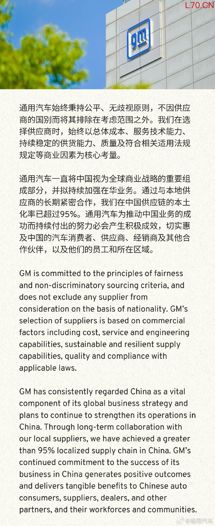 通用汽车:公司在中国供应链的本土化率已超过95%