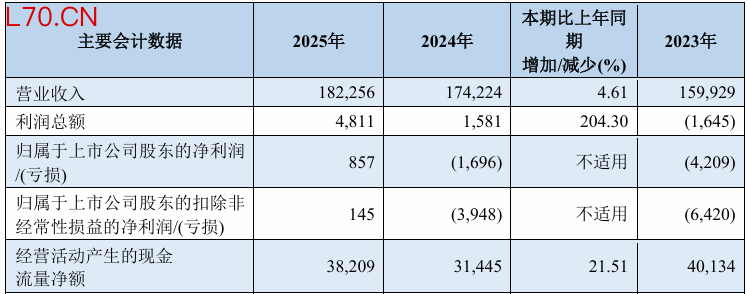挖贝4月1日消息,日前南方航空(600029.SH)公布了2025年财报。去年,公司实现营业收入1822.56亿元,同比增长4.61%;实现归母净利润8.57亿元,上年为-16.96亿元。