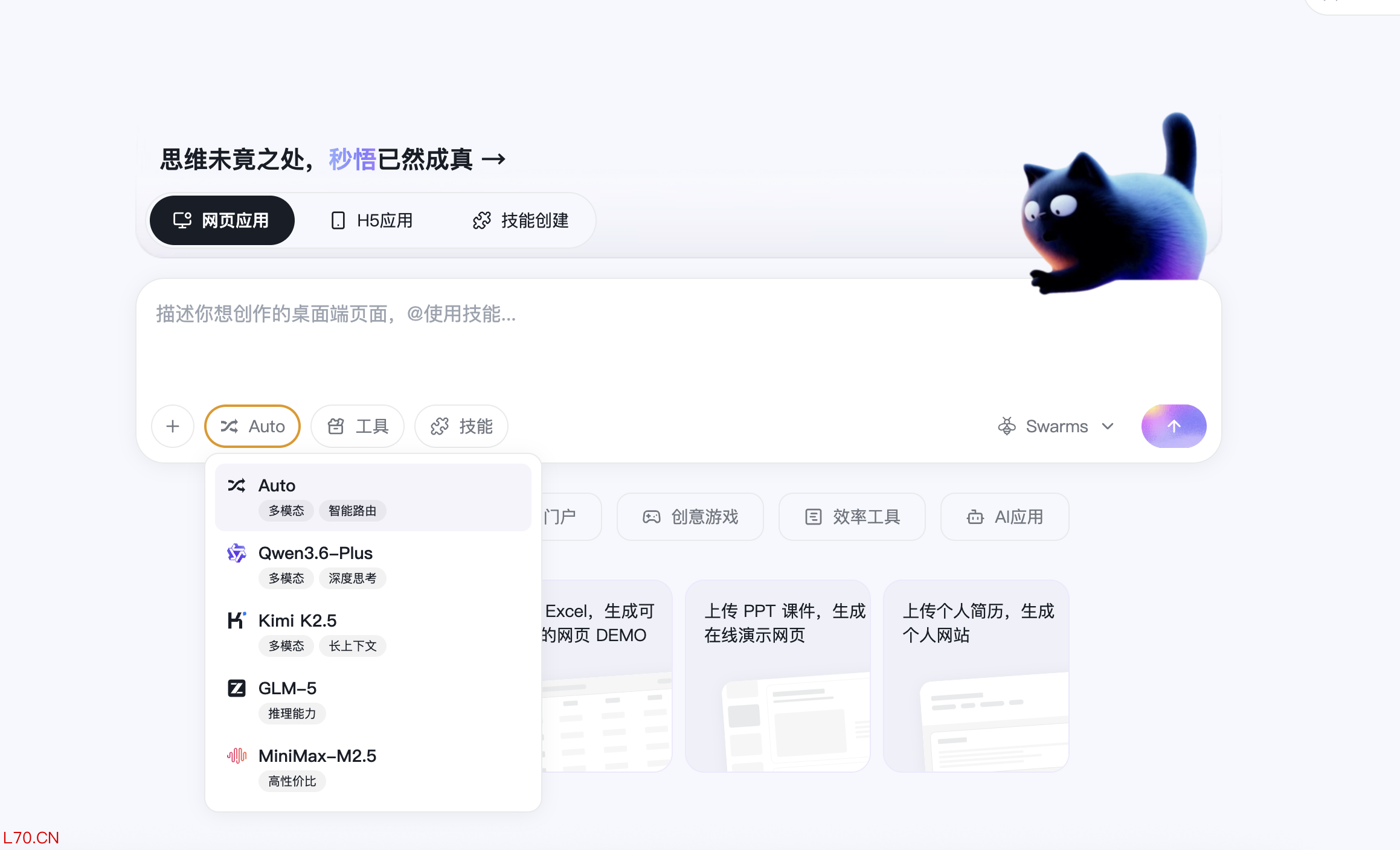 元股证券:ygzq.hk配资网站页面信息显示,Meoo在模型层集成了Qwen3.6-Plus、Kimi K2.5、GLM-5、MiniMax-M2.5大模型。用户可在页面选择网页应用、H5应用、技能创建等选项,自主选择对应的大模型或自动匹配模式,输入自然语言指令,Meoo就会自动进入对应的代码书写。