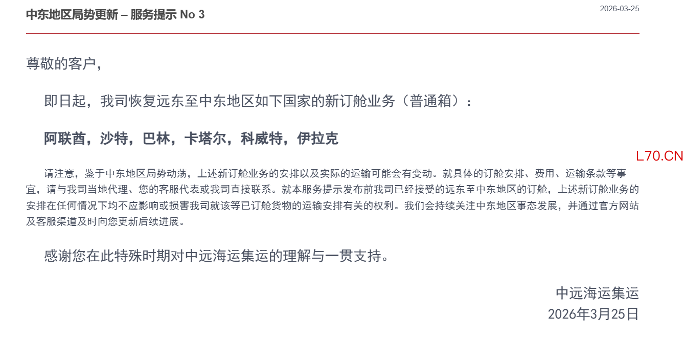 中远海运集运:即日起恢复至阿联酋,沙特,巴林,卡塔尔,科威特,伊拉克的新订舱业务