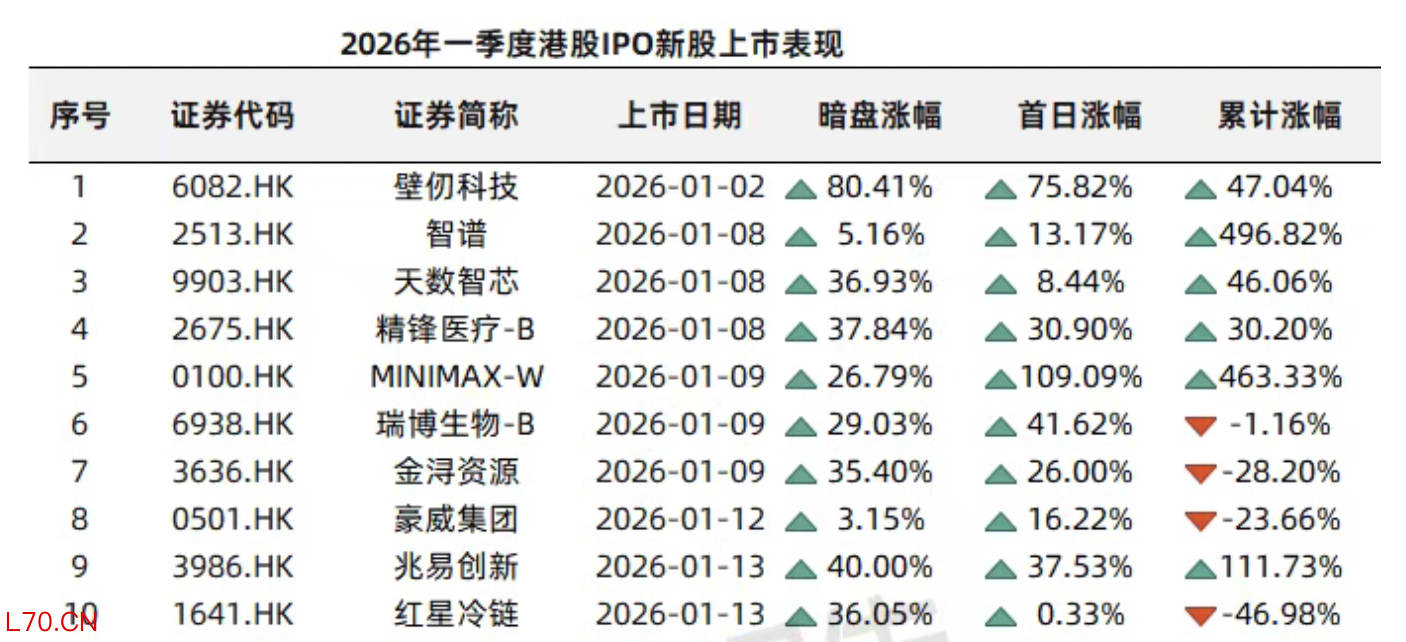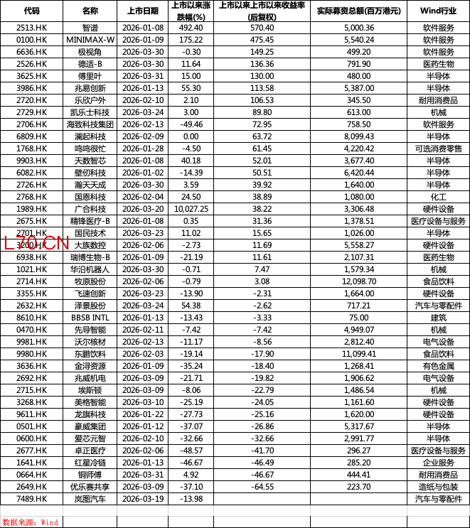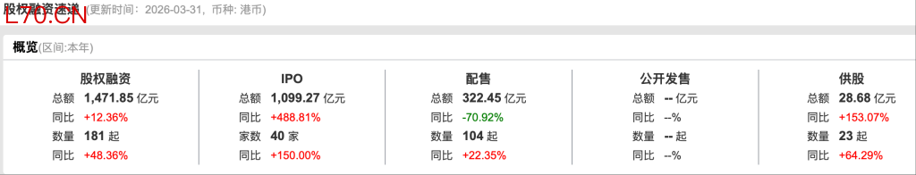 这只是2026年开年港股IPO持续火热的一个缩影。Wind数据显示,截至2026年3月31日,一季度港股市场共有40家企业完成IPO上市,同比大幅增长150%;合计募集资金1099.27亿港元,同比激增约489%,仅用78天便突破千亿港元募资大关,创下历史最快破千亿纪录,也刷新了2021年以来的季度募资新高。