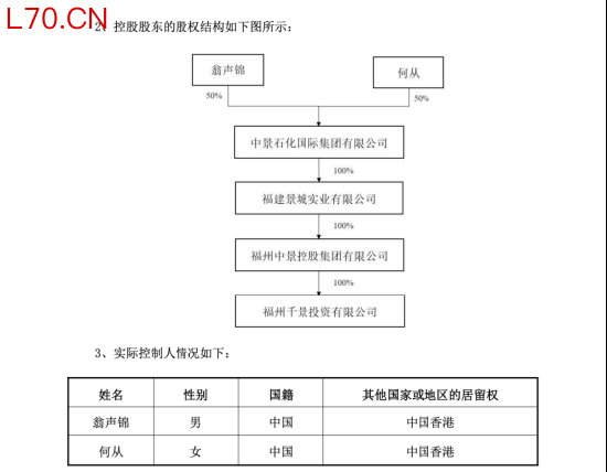 公告和详式权益变动报告书均显示,中景控股持有福州千景100%股权,翁声锦、何从夫妇通过直接持有中景石化国际集团有限公司100%股权,间接控制福州千景100%股权,为福州千景的实际控制人。随着股份过户完成,这对夫妇也正式成为中晟高科新的实际控制人。