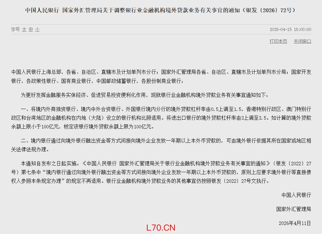 问:《关于调整银行业金融机构境外贷款业务有关事宜的通知》(简称《通知》)出台的背景是什么?答:2022年,为发挥好跨境金融服务实体经济发展的作用,支持和规范银行开展境外贷款业务,中国人民银行、国家外汇管理局发布《关于银行业金融机构境外贷款业务有关事宜的通知》,建立了本外币一体化管理、本币优先的银行境外贷款政策框架。近年来,银行境外贷款业务稳妥有序开展,境外贷款规模稳步增长,人民币贷款占比不断提升,对支持“走出去”企业境外经营等发挥了积极作用。同时,部分银行围绕贷款余额上限、用途管理等方面提出了一些问题和诉求。中国人民银行、国家外汇管理局在充分研究论证并征求银行意见的基础上,联合发布《通知》,调整优化相关规定。问:《通知》对现行境外贷款政策做了哪些调整?答:《通知》做了两方面调整。一是提高境外贷款余额上限。《关于银行业金融机构境外贷款业务有关事宜的通知》明确,境外贷款余额上限=境内银行一级资本净额(外国银行境内分行按营运资金计)×境外贷款杠杆率×宏观审慎调节参数,如计算所得上限小于20亿元,则核定为20亿元。同时,结合各银行一级资本净额及存量业务规模,对国家开发银行(1.5)、进出口银行(3)和其它银行(0.5)设置了差异化的杠杆率,为银行业务开展预留了较为充足的空间。近年来,随着境外贷款业务发展,部分银行境外贷款余额逐渐接近上限。《通知》结合各银行业务规模及境内外资银行资本规模相对较小等实际情况,将境内外资银行的杠杆率由0.5上调至1.5,将进出口银行的杠杆率由3上调至3.5,并将20亿元核定上限上调至100亿元,更好支持外资银行、进出口银行发挥业务优势,满足境外企业合理融资需求。二是优化间接方式贷款管理要求。《通知》第二条明确,境内银行通过向境外银行融出资金等方式间接向境外企业发放一年期以上本外币贷款的,可由境外银行依据其所在国家或地区相关法律法规办理。《通知》出台后,境内银行应遵循依法合规、审慎经营、风险可控原则,开展相关业务,进一步完善内控制度和业务操作规程,与境外银行通过合同约定等形式,明确资金使用条件,有效防范风险。