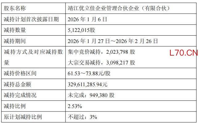 公司于2026年2月26日收到优立佳合伙出具的《关于提前终止减持计划暨减持股份结果的告知函》,优立佳合伙于2026年1月27日至2026年2月26日期间合计减持公司股份5,122,015股,占公司总股本的2.53%,并于2026年2月26日提前完成本次减持,本次减持完成后,优立佳合伙持有公司股份20,571,132股,占公司总股本的10.16%。本次减持价格区间61.53至73.88元/股,减持总金额329,611,285.94元。