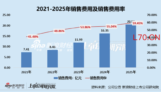 公司营收自2023年后恢复增长与营销开支的大幅增加存在一定联系。近年来公司销售费用持续高增,2023年、2024年及2025年前三季度,公司的销售费用分别为11.99亿元、16.35亿元及20.57亿元,分别同比变动41.65%、36.38%及25.8%,销售费用率更是从53.86%增长至59.45%。相当于每100元营收中,就有近60元用于销售投放。